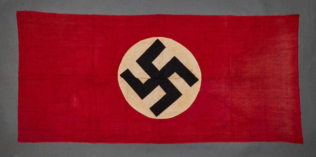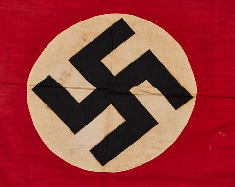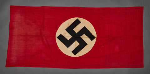 WWII NSDAP Party Flag- This flag is two sided multi piece constructed with a printed swastika on white center. This flag exhibits some discoloration and some areas of staining. There are a few small holes and one slightly larger hole on edge. Its measures 63” x 29” (160cm x 74cm.) Overall representative example with a good display or collectable size.