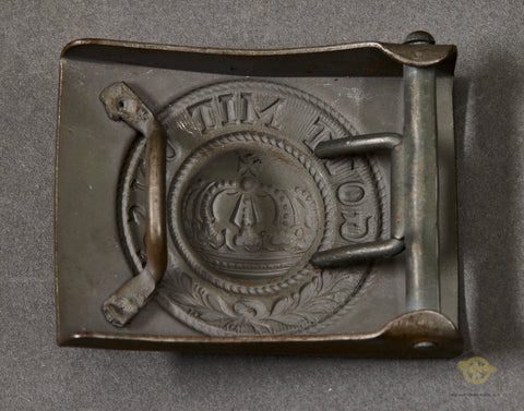 German Early Imperial Army WWI Belt Buckle-This is a handsome offering. This early WWI army combat buckle is the 1895 pattern. It is made of steel. It retains the majority of its original olive green finish, though there is some rusting bleeding through the finish on the reverse. The same is true for the legs of the catch, as well as the rollbar, so please be sure to see photos. The details to the crown, and the motto "PROVIDENTIAE MEMOR" are very strong. The motto translates to “Remember Providence". Overall, this early buckle is in good condition.
