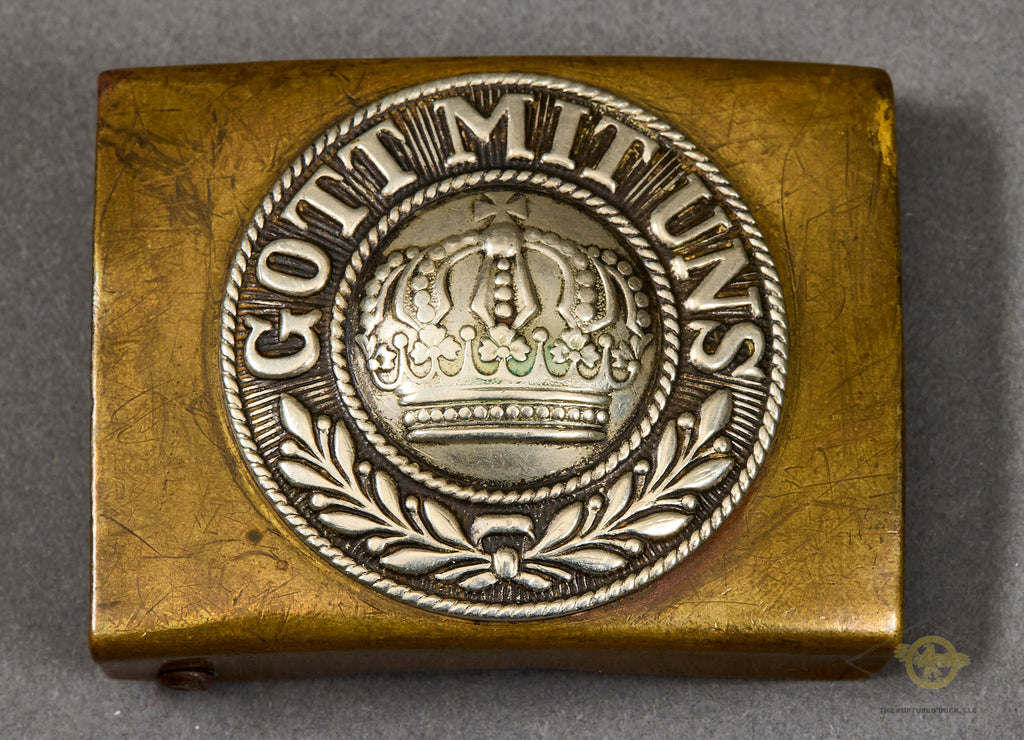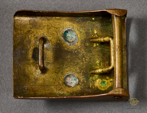 German WWI Early Brass Buckle-This is a beautiful early army buckle made of brass with a separately applied silver rondel. The plain brass field has an excellent tone. The silver rondel shows the early crown, surrounded by the “Got Mit Uns” motto and wreath. Overall, this early buckle is in very good condition.