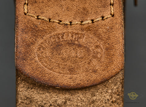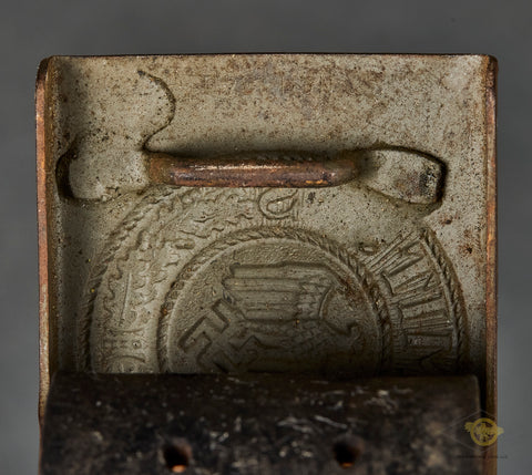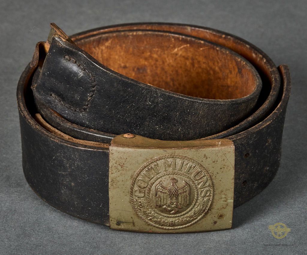 Veteran Bring Back German WWII Army Belt and Buckle Set-This an interesting set. This is a tropical style army buckle on a very nice black leather field belt. This has the adjustment holes in the belt. This buckle is very well marked and has the size in cm marked at the end. This belt is 41 inches (105cm) so it will fit up to a size 37 waist. The steel army buckle retains the majority of its original olive green finish. This buckle is very nicely marked with N&H for Noelle & Hueck from Lüdenscheid, with the date 1940. This buckle was brought home by a US veteran; we will supply the biography that we received from his grandson. This is an excellent find overall.