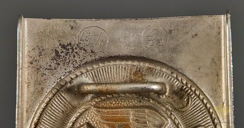 Veteran Bring Back German WWII HJ Buckle by Overhoff & Cie-This is produced in steel with a nickel silver finish that is almost fully intact. This is a one-piece model and is an excellent example with almost no wear. The catch is “U” shaped, and the roll bar/prongs are plated steel. The buckle is marked with the RZM M4/27 indicating production by Overhoff & Cie of Lüdenscheid. This buckle was brought home by a US Soldier; we will supply the name of this veteran to the buyer. This is in near excellent condition!