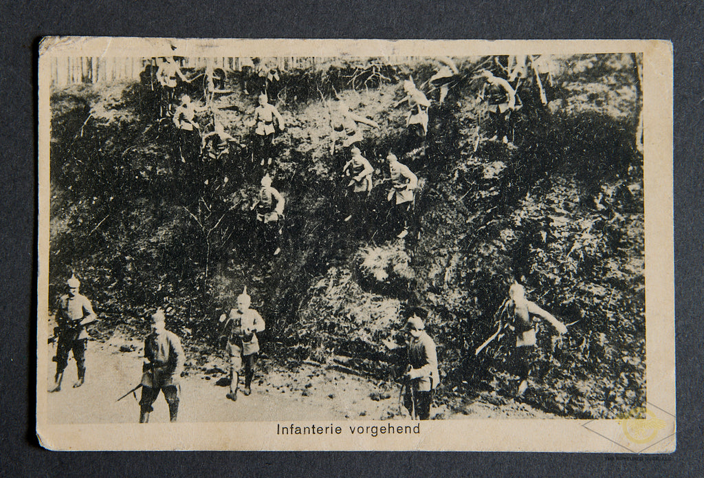 German WWI Postcard of an Infantry Advance-This is a great early photo of an infantry advancing. You can see 15 or more guys in early WW1 uniforms advancing down a hill. There is a caption below the photo. This would have been one of a series of collectible postcards. This postcard measures 5 ½ inches (13.97cm) long and 4 ½ inches (11.43cm) wide. The reverse is setup in postcard style and does have a note and an address written on it. There is a cancellation stamp, but no postage stamp. This shows some wear but overall is in good condition.