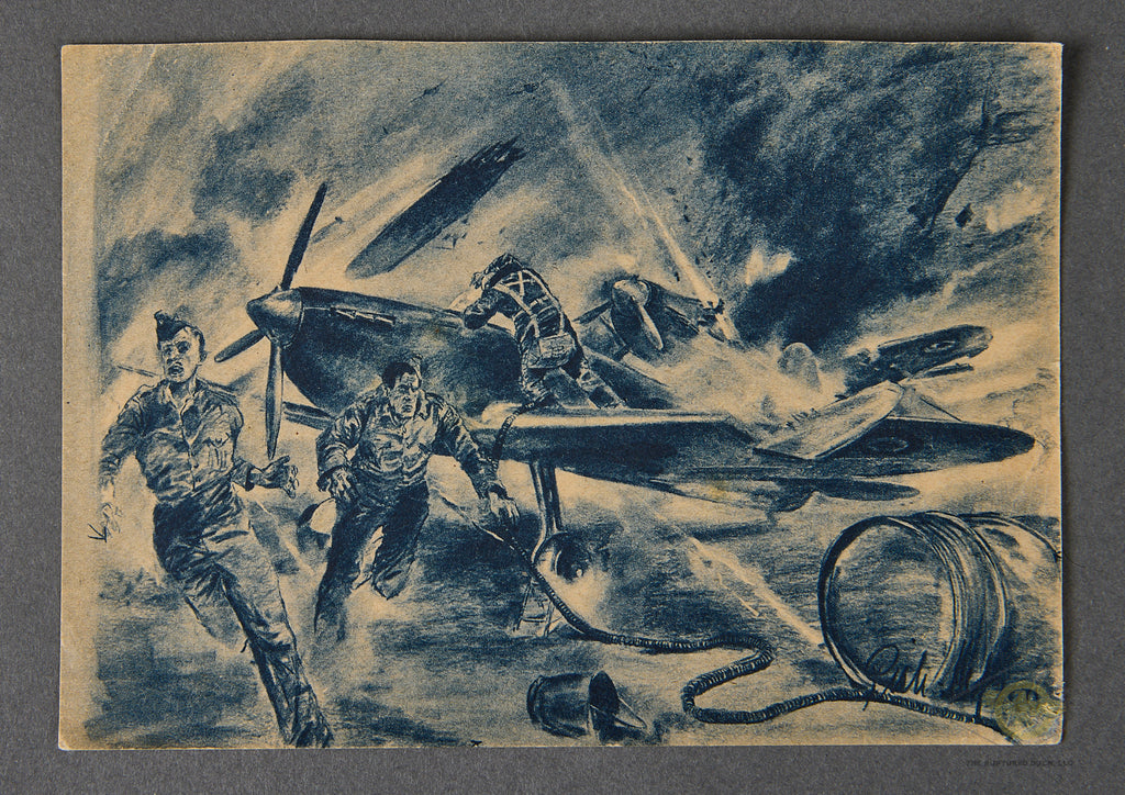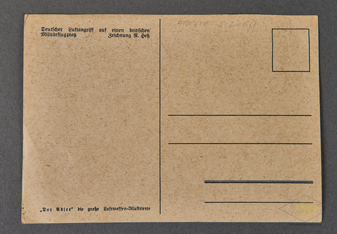 Original Luftwaffe Postcard-This postcard shows an image of an air raid battle by the artist Ron Hess. It appears that this may have first appeared in the Luftwaffe magazine “The Adler” and then became a propaganda postcard. This image is beautifully illustrated in black and white, with a blue tone to it. It shows three British airman attempting to escape from a German air raid on their aircraft. The caption on the reverse reads “German air attack on British military aircraft”. This postcard measures approx. 5 ¾ inches tall (14.6cm) and 4 ½ inches (10.79cm) wide. The reverse is setup in traditional postcard style, there is no stamp. This remains unused.