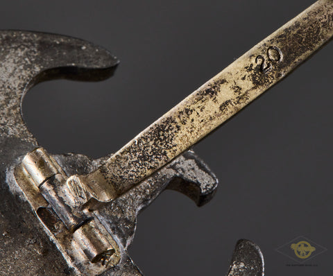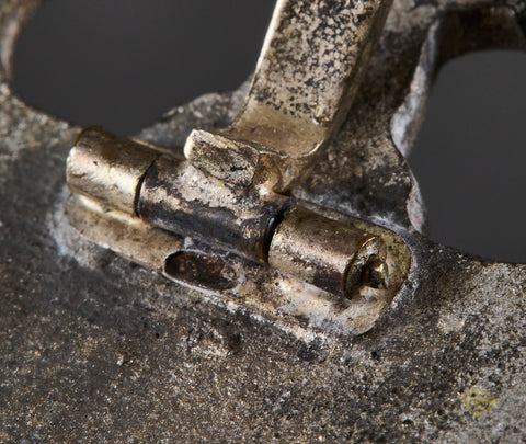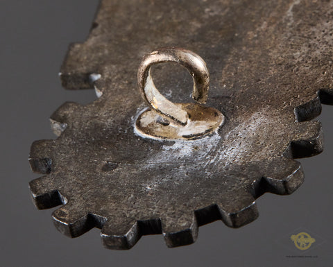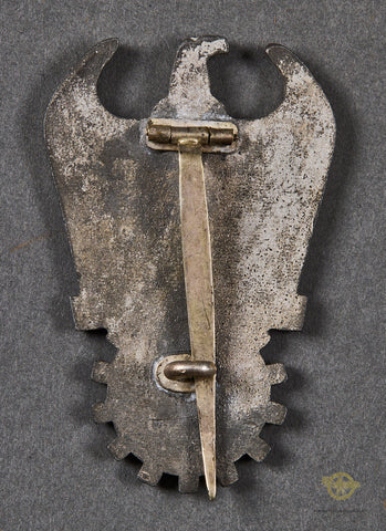 German WWII Dr. Fritz Todt Prize in Silver-This is a rarely encountered example of a second-class Fritz Todt prize. It has lost all of its original silver finish, but is still quite handsome. This large pin in the shape of an eagle with semi-folded wings, looking left, standing on a scroll with the words DR. FRITZ TODT. Beneath the scroll is a swastika in a cog wheel motif. This pin measures 2 ½ inches (6.35cm) tall and just over 1 ½ inches (3.81cm) at the widest point of the wings. It is heavily constructed in a zinc material. The zinc has toned to a nice gray color and retains excellent details. On the reverse is a hinged silver pin with retaining hook running vertically down the center. The pin on this example functions but is very stiff. The reverse retains some of the original silver finish. I have not had one of these to offer you in quite some time. Overall strong/very good condition.