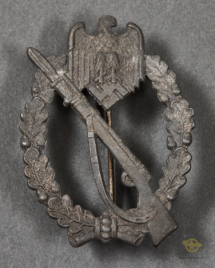 History: The infantry assault badge in silver was introduced on December 20th, 1939 by Generaloberst Walther von Brauchitsh, as an award for officer’s and EM/NCO’s of non-motorized infantry and Mountain infantry units. The criteria for the badge varied, with the main qualification being the participation in three separate infantry assaults. On June 1st, 1940 a bronze version of this Infantry Assault Badge was introduced as an award to Officer’s and EM/NCO’s of Motorized infantry units. The criteria for the bronze badge matched those of the silver badge; again, with the main qualification being the participation in three separate motorized infantry assaults.