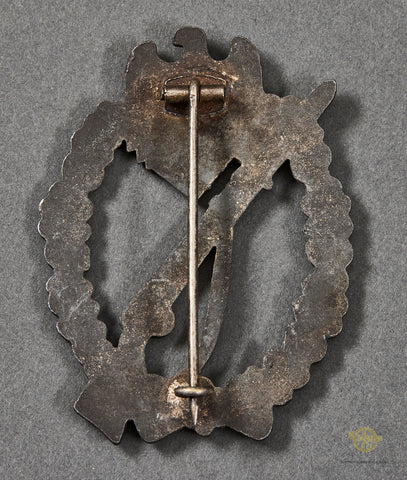 German WWII Infantry Assault Badge-This is a solid strike example constructed in zinc. It has lost all of its original finish. It does retain good detailing, especially to the wreath and gun. The silver pin, hinge and catch setup work as they should. This is a sound example.