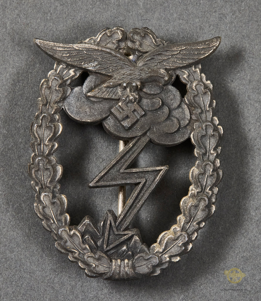 History: These were instituted by order of Reich Marshall Göring on March 31, 1942. To receive the badge, it was required you take part in three separate ground attacks in combat or combat support capacity. The member had to be either directly involved in the assault or hand to hand combat or be directly supporting such action. Members killed in action were automatically awarded the badge. Members of Assault Gun Units and Parachute Units were authorized to receive the badge, providing they met the same qualifications, but on three separate combat days. The badge takes the form of a matte silver oak leaf wreath surmounted by a Luftwaffe eagle. The center portion is a lightning bolt striking from a cloud, both darkened.