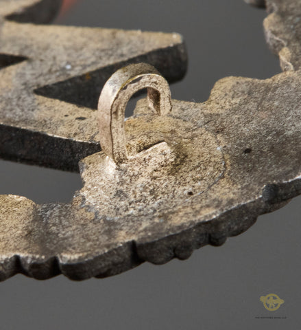 German WWII Luftwaffe Ground Assault Badge by Osang-This is a good example of a ground assault badge. It is made of zinc. It retains approx. 20% of its original finish. It has toned to light and dark gray colors, which gives this badge the dimensions it was intended to have. It is marked on the reverse for Osang. The silver pin retains its finish, and it functions as it should. In good shape.