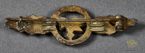 German WWII Luftwaffe Operational Flying Clasp for Air Transport/Glider Squadron Flying Clasp-This is a nice example in bronze. It retains the majority of its original finish. The eagle holding the swastika is a bronze color. This badge has great details. It is a single rivet construction. The toned bronze long pin assembly is intact, and functions as intended. There is a slight bit of verdigris to the reverse, and the hinge and catch remain uncleaned, so please be sure to look closely at the photos. Overall, a handsome badge.