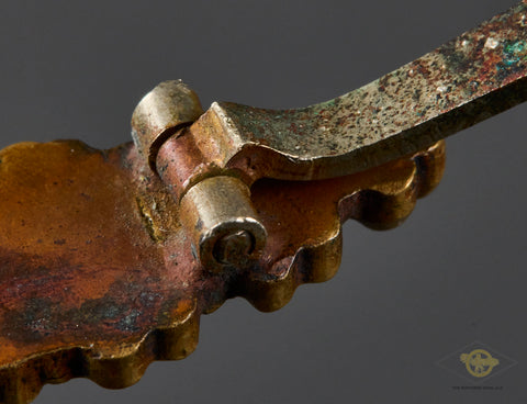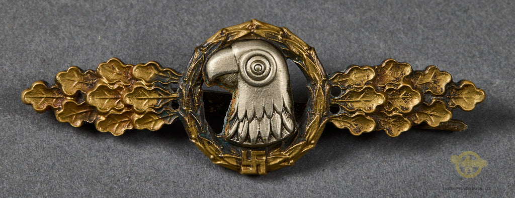 German WWII Luftwaffe Reconnaissance Flying Clasp in Gold-This is an unmarked example, which is how these clasps should normally be found. The gold gilt of this badge is mostly intact on this piece and is only missing on the inside edge of the wreath. The remaining gold highlights on the oak leaves and wreath look really good. The burnishing on the eagle is also very good. The reverse of this badge does show some finish loss and discoloration, so please be sure to look closely at the photos. The hinge and pin setup functions perfectly. This is a very desirable clasp.