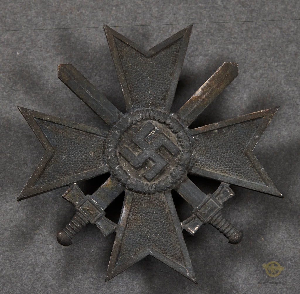 Veteran Bring Back German WWII War Merit Cross 1st Class w/Swords-This badge is in sound condition. It has lost all of its original silver finish. It is made of zinc, with sound details to the badge. The pin on the reverse retains a bit more of the toned silver finish. The pin is marked with the number 4, indicating that this badge was made by Steinhauer & Lück. We were able to purchase this medal directly from the family of the US Veteran. We will supply the name and any other information we have to the buyer. This is a good example overall.