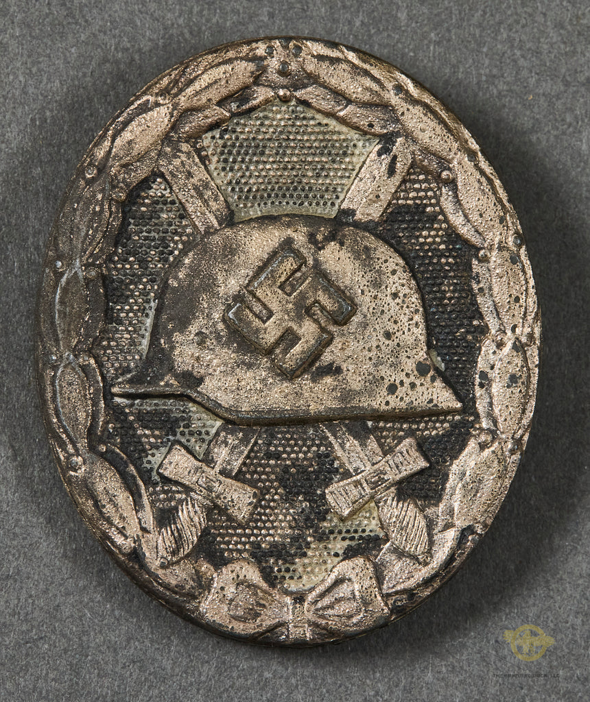 History: The wound badge was originally established on March 3rd, 1918 by King Wilhelm II to recognize the sacrifice of those wounded during WWI. The badge was instituted in three classes of black, silver and gold with the class bestowed reflecting the number or severity of the wounds received. On May 22nd, 1939 Adolf Hitler re-instituted a slightly modified version of the wound badge with the addition of a swastika to the WWI pattern badge for award to German volunteers who had been wounded supporting the Spanish Nationalist Falangist Generalissimo Francisco Franco against the communist allied Republican Loyalist party in the Spanish Civil War. (July 1936-March 1939). With the outbreak of WWII, on September 1st, 1939, Hitler once again re-instituted another slightly modified version of the wound badge by altering the WWI pattern helmet on the badge to the newly designed M35 style helmet. The badge was awarded to both military and uniformed non-military personnel and later, (March 1943), to civilian personnel who received wounds as a result of enemy actions. The black wound badge was the lowest of the three classes and was awarded for one or two wounds.