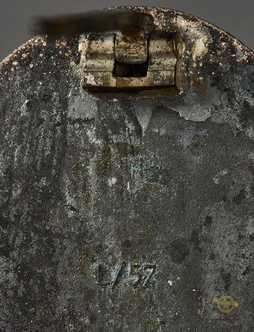 WWII German Silver Wound Badge, Maker Marked "L/57"-This example is produced in zinc. The silver finish remains 30% intact. There is moderate wear and finish loss. There is a block hinge, and a tapered pin but the catch is missing. Please be sure to see the photos. This is in “As found” condition. The reverse of the badge is marked L/57 which indicates it was produced by Boerger & Co. Berlin. Again, this is in “as found” condition, but would make a nice place holder. Priced accordingly.