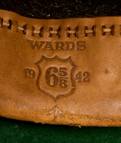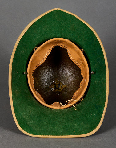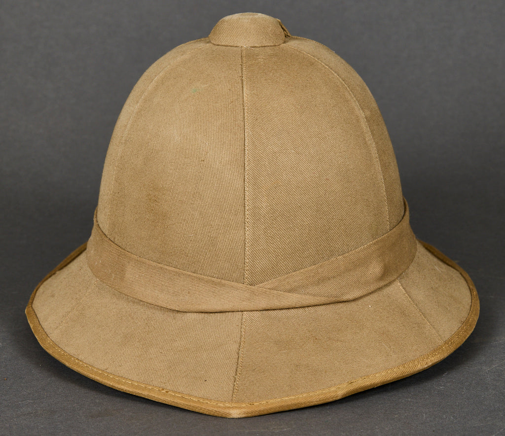 British Pith Helmet Dated 1942-This is a good example of a British wartime pith helmet. These helmets were made of a hardened cork material, covered in khaki cotton drill material. Underneath this is lined in a silver foil to reflect the tropical sun. You can actually see a hint of this silver foil if you look inside, at the center of the cap. The top of the cap has a ventilation button. There is the khaki colored center band as well. There is one spot of discoloration on the right side of the center band, please be sure to look closely at the photos. The underside of the cap is lined in green velvet that is also in good condition. There is some moth tracking and some moth bites on this felt. The leather sweatband is in place and well marked for “Wards” and dated 1942. Please be aware that the chinstrap is missing on this example. This cap would have been worn most likely while in North Afrika or the Middle East during this time period. A good looking example.