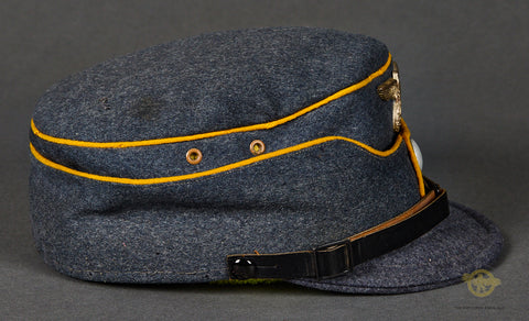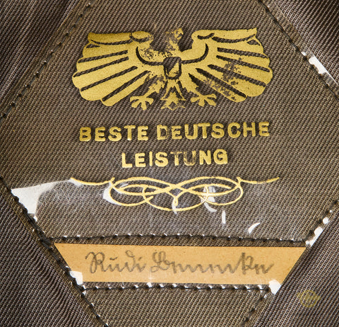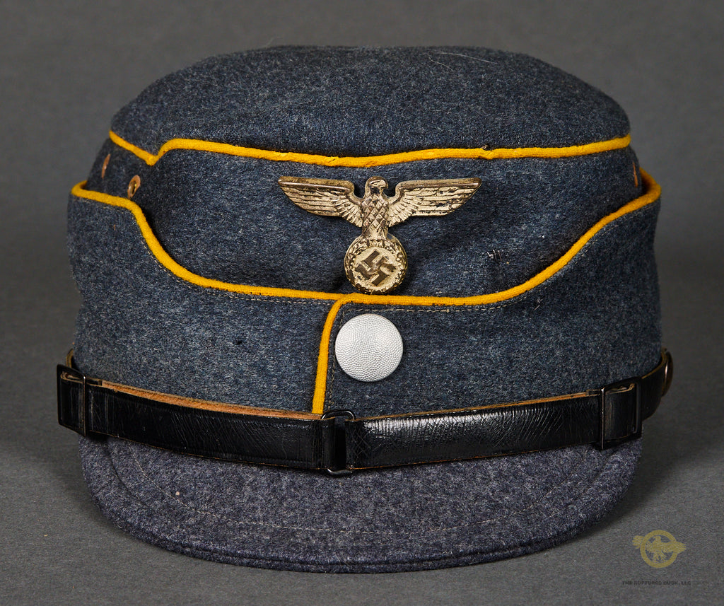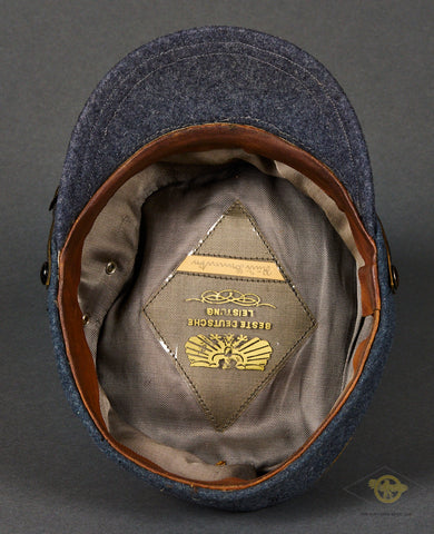 DLV/NSFK Kepi, Named-This is a very high quality private purchase example in near excellent condition. The blue grey wool body is very soft and clean, with minor wear and a small hole on the back of the top panel. The top panel stiffening ring was removed by the owner. The top panel as well as the scallop are piped in yellow. Each side has a pair of enameled ventilation grommets. It has a small bill that is also produced in blue grey wool. The eagle is nickel silver over tombak with most of the finish intact and minor toning. There is a single button at the front, silver finished pebbled metal. There is a black patent leather chinstrap that is in fine condition. The interior is fully lined in grey green rayon that is excellent. There is a diamond shaped moisture shield that is fully intact. There is an eagle logo and the script “Beste Deutsche Leistung”. There is a name tag inside with script that is hard to read. The sweatband is brown leather and in fine condition, remaining very soft and supple. The kepi is a size 56. Very good condition!