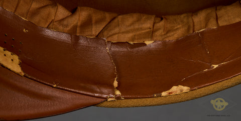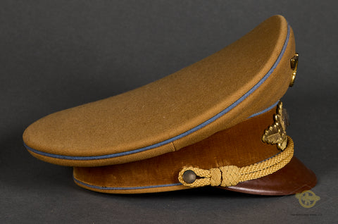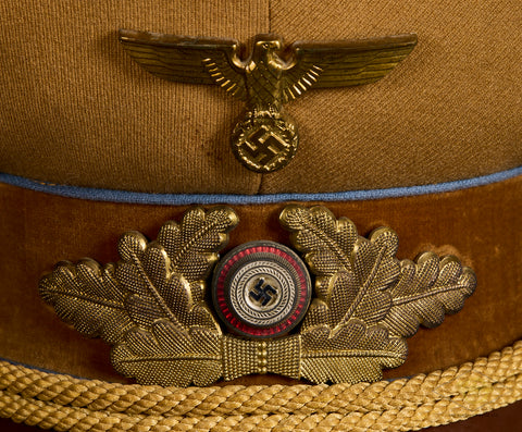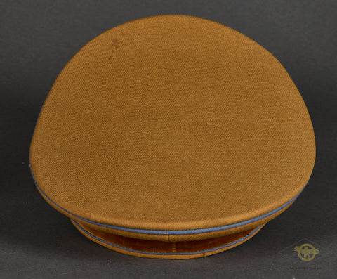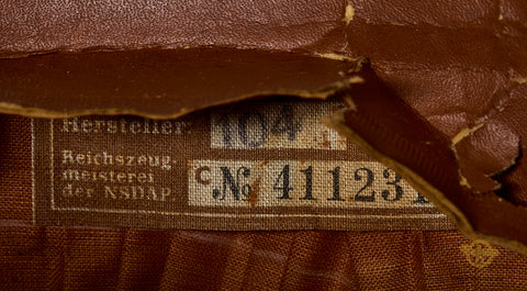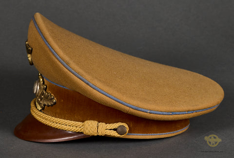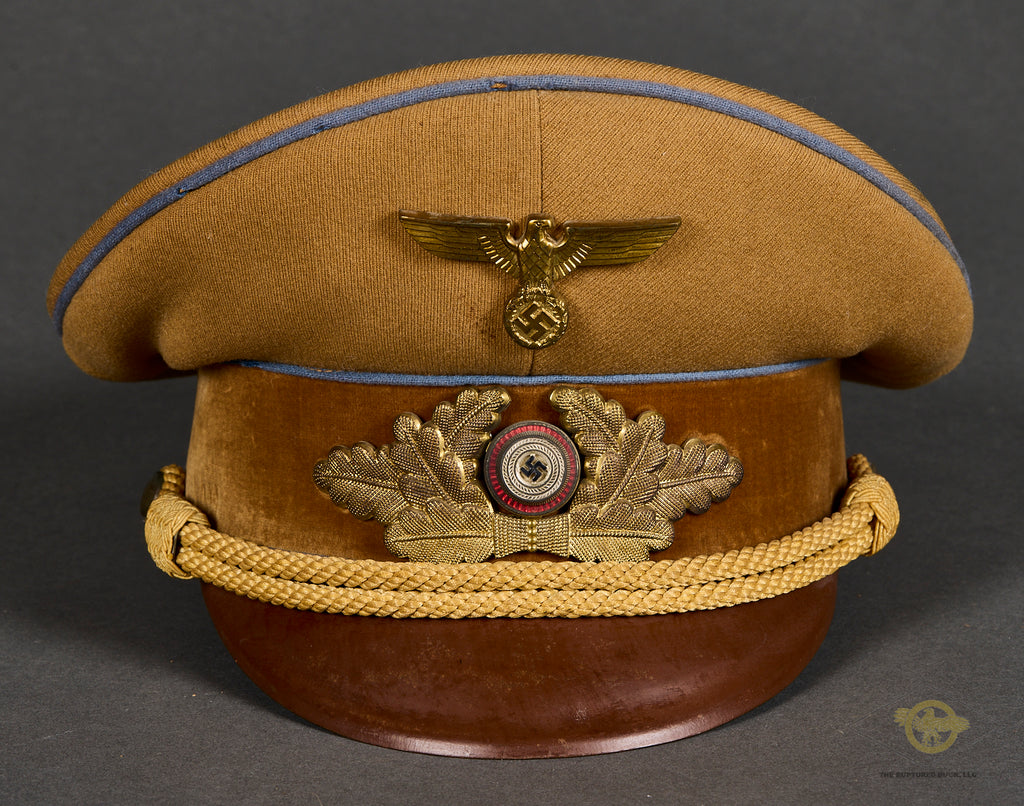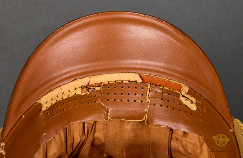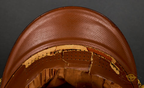 German WWII Political Leader’s Visor Cap for Ort Level-This is blue piped for ORTS level. The piping is a light blue color and some very slight moth damage. This cap has a beautiful saddle shape and the exterior and the brown center band are damage free as is the celleon officer’s chin cord. The gilted finish on the eagle has toned to a matte gold color and the original finish is mostly intact. The gilt finish on the stylized wreath has a nice matte gold tone to match the eagle. The enameled cockade is in very good condition. The interior of this size 56 cap has a complete moisture shield, and a mostly complete yet fragile sweatband. It is torn in some spots, and one piece has come loose. Please be sure to look at the photos to see this. This is a handsome visor cap in very good condition.