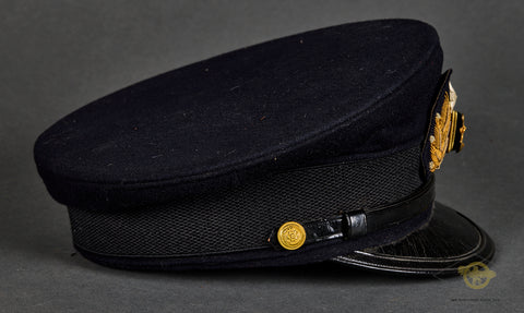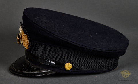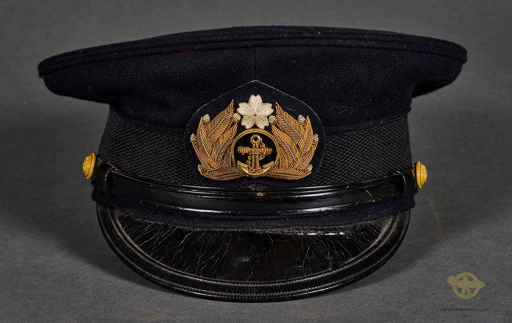 Japanese WWII Navy Officer’s Visor Cap Named-This handsome cap is produced in dark navy-blue wool. It is in good condition with minor wear and discoloration only. Please be aware that it is slightly misshapen and should pop up on a mannequin or head stand. The center band is ribbed black cotton. The insignia consists of a gold bullion wreath, a metal anchor and a metal chrysanthemum. The black patent leather chinstrap and black leather visor have very slight age crazing but are otherwise very good. The interior is fully lined in purple rayon that has separated from the sweatband and shows minor wear. The black leather ersatz sweatband is in very good condition. The owner stitched his name into the lining in gold on black rayon. It is size 54. Overall excellent condition!