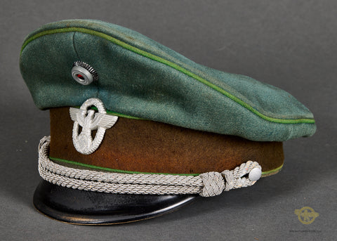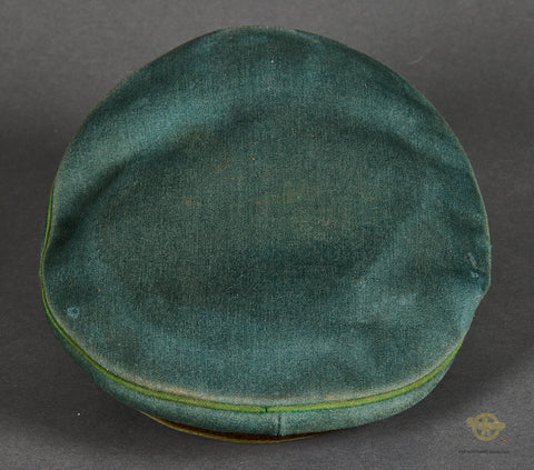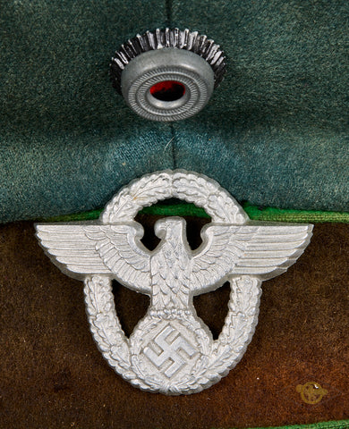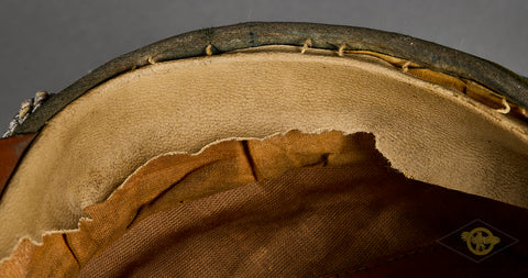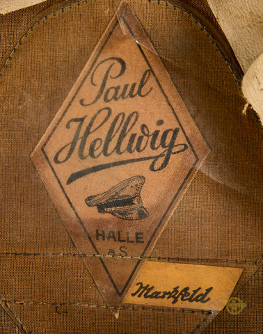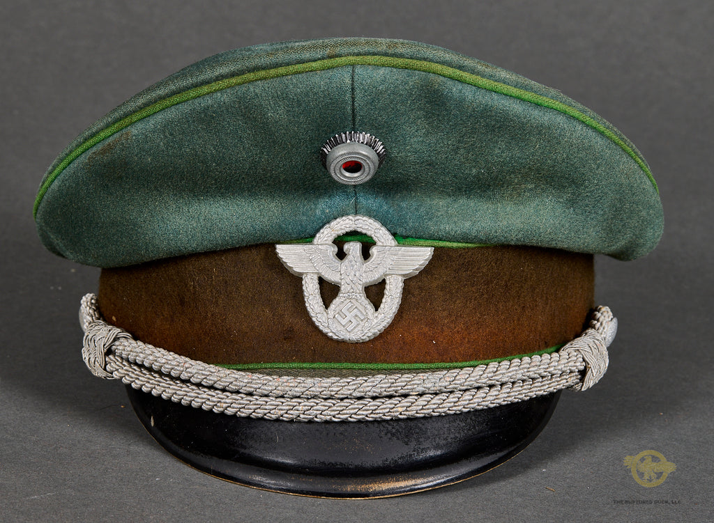 Third Reich Schutzpolizei Officer Visor Cap, Named-This cap has a few liabilities. The center post in the interior is broken, so this is misshapen and needs to be reshaped. It is produced in blue green wool that is in good condition, with minor wear and discoloration only. The green piping is for schutzpolizei (municipal) police. The center band is chocolate brown badge cloth and has three small holes. The insignia is excellent, and retains almost all of the original finish. It is in the style of the other ranks insignia which is very common to find on police officer caps. The chin strap is a double bullion officer style. The visor is black vulkanfibre, showing minor fading and crazing only. The underside is orange brown and cross hatched and shows some discoloration. The top panel of the interior is lined in golden brown rayon while the sides are golden brown cloth. There is a diamond shaped moisture shield that is maker stamped and has a paper name tag in the slot, this reads Paul Hellwig Halle. Near this is a name of Markfeld handwritten on a small paper tag. The tan ersatz leather sweatband is very stiff with moderate wear and tear. The cap is a size 57. Overall, good condition! Bargain price based on condition.