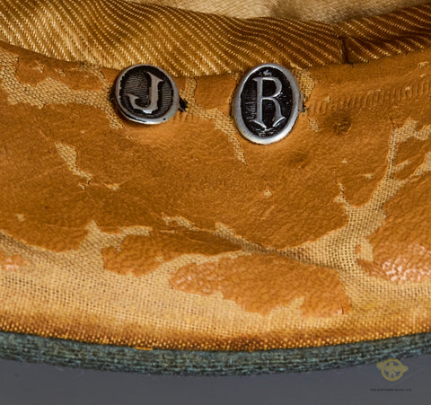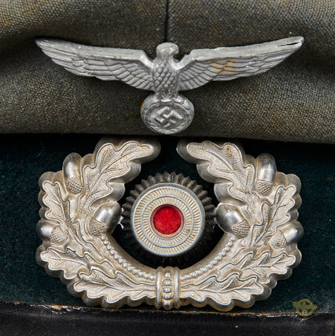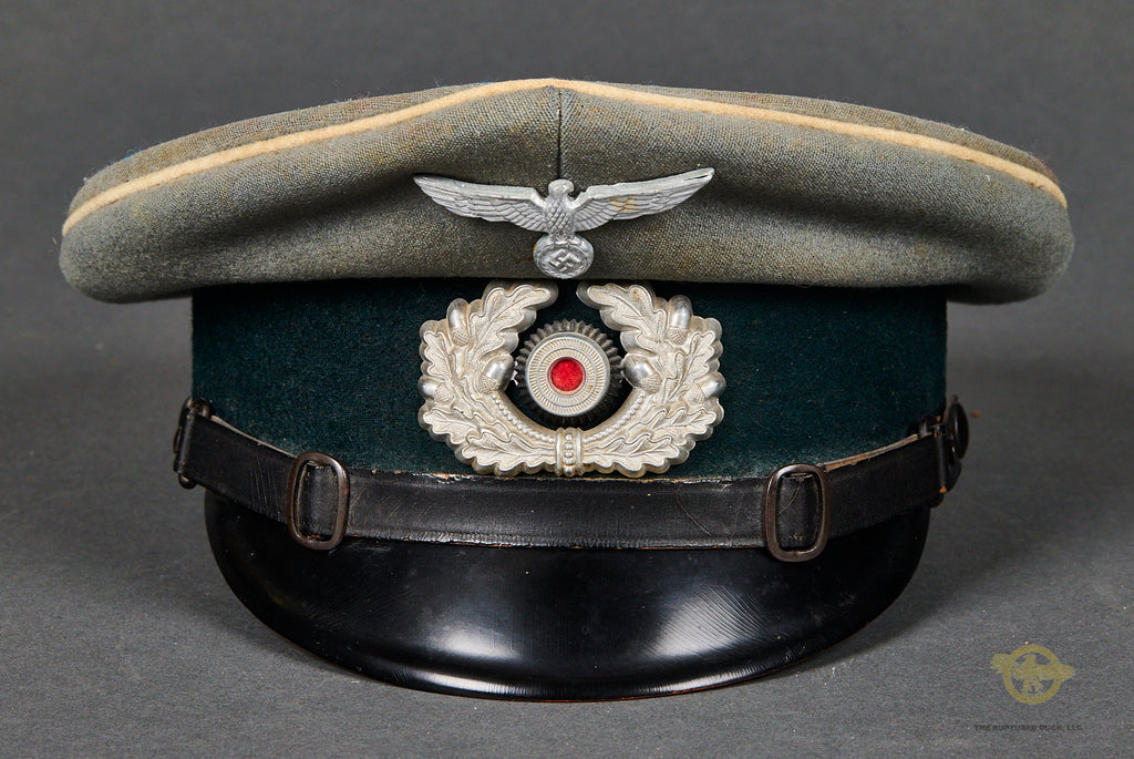 WWII German Army Infantry Other Ranks Visor Cap, Private Purchase-This private purchase example is produced in soft, field gray wool in a classic tellar shape. It is clean, with minor wear and tracking in a few spots. There are a few small moth nips on the underside of the cap, please see pics. The white infantry piping is fully intact with minor discoloration. The center band is dark green badge cloth. The insignia is zinc, with most of the finish present on the cockade and wreath but mostly missing on the eagle. The chinstrap is black leather and fully intact with minor fading. The visor is black vulkanfibre with minor fading and crazing. The underside is cream colored with some wear from use. The interior is fully lined in gold rayon. It has minor discoloration and moderate wear with some missing material. There was a moisture shield but it is missing. You can see the maker nomenclature but it is heavily worn. The sweatband is tan leather. It has a significant amount of wear and is fragile. There are initials on the sweatband, JR. The cap is a size 57. Overall a very good example!