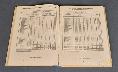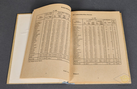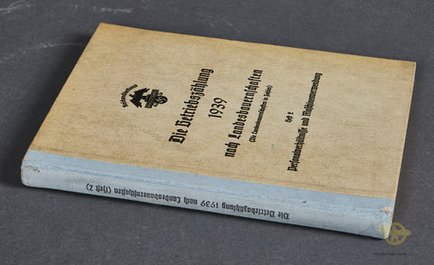 Die Betriebszählung 1939 nach Landesbauernschaften-Original 1939 Census book that was used to document regional farmers, agricultural associations, and it specifically addresses personal relationships and machine usage. (Personalverhältnisse und Maschinenverwendung.) The beige hardcover shows The Reichsnährstand or 'State Food Society' emblem on the cover with the date 1939. This was an organization active during wartime responsible for agricultural policy. The book is full of statistics gathered from the Riech statics office. For example, there are charts that lists how many males live in each household, ages and if they are employed or not. The book is in very good condition. The blue binding is tight. There is a name written in pencil on the inside cover, and overall, the 185 pages are very clean. A very interesting (yet dry reading) NSDAP statistic book.