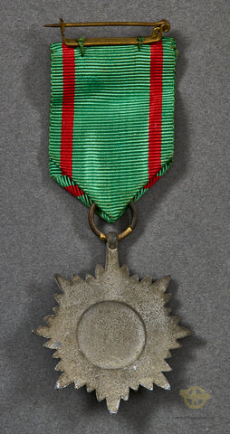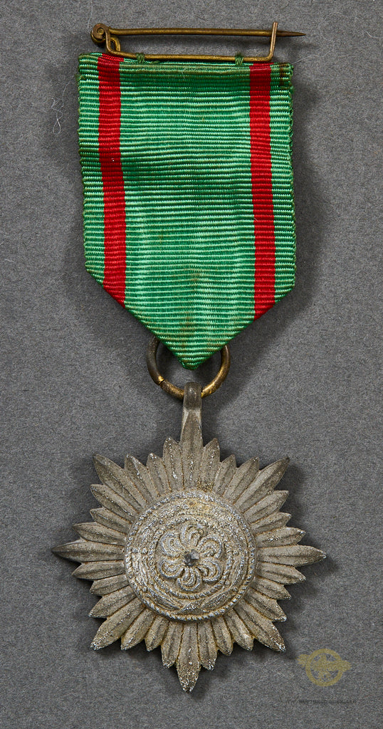 German Decoration for Bravery and Merit of the Eastern People 2nd  Class in Gold w/o Swords, with Original Ribbon-These were awarded in two different classes (First and Second) at three different levels (Bronze, Silver, Gold) for both bravery (with Swords) and service (without Swords) to Russian volunteers fighting under German leadership. This example is Gold, Second Class, without swords and includes its correct green and red ribbon. This example is missing all of its gilt finish, with moderate wear to its details. The pin on the ribbon functions properly. This is a sound example.