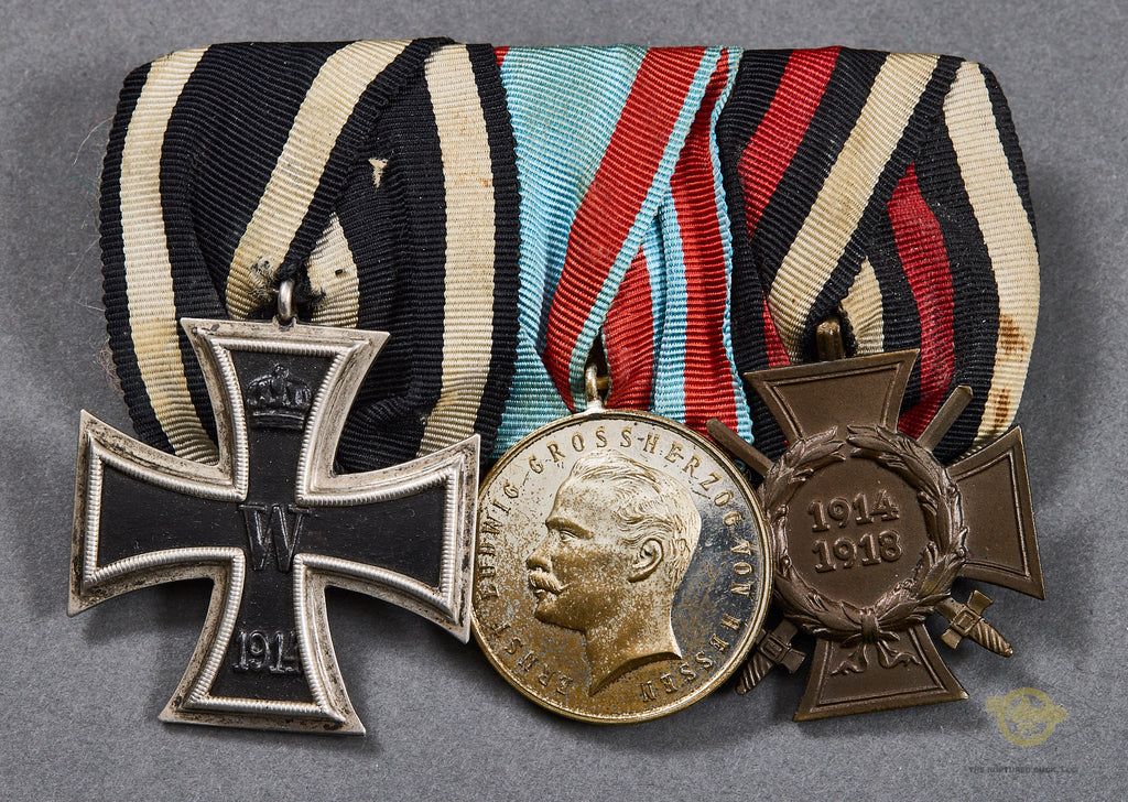 German WWI 3 Medal Bar-This is a handsome early 3 medal bar. The first medal is the 1914 Iron Cross that is in near excellent condition. It retains its finish and has nice toning to the silver frame. The next badge is a WW1 Hessian General Honor Decoration for Bravery. The third medal is the bronzed cross of honor with swords. This award is maker marked on the reverse. The ribbons of the bar do show slight wear and some discoloration but are in very good condition. The reverse of this bar is a black felt badge cloth, and a horizontal pin that functions properly. Overall, good looking medal bar.