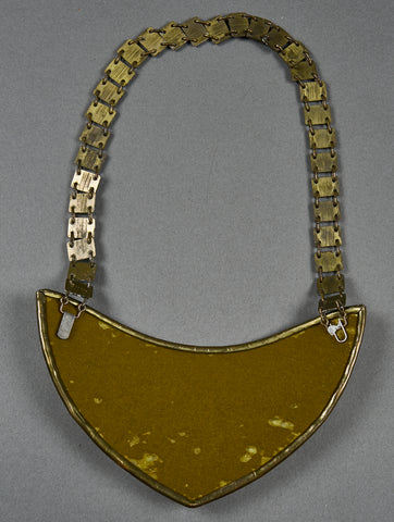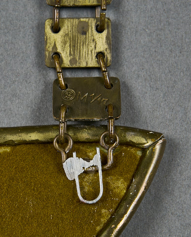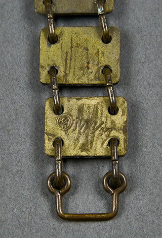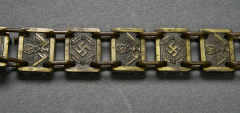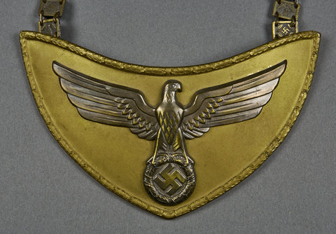 German WWII 2nd Model Political Leaders Gorget-This large gorget has a bronze finish that remains 99% intact. The separately applied eagle remains firmly attached. The finish to the eagle is fully intact and the details are stunning. The reverse is lined in olive brown badge cloth which has minor discoloration, slight wear, and several small holes. The complete chain with alternating swastikas and eagles is RZM marked M1/17 for Assmann. The gorget clip is RZM marked M5/8 which is also the mark for the maker Assmann. One stud has been replaced, but otherwise this would be excellent.