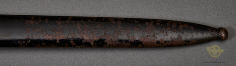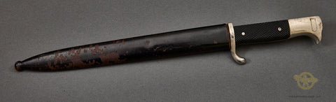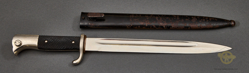 German WWII Long Model Dress Bayonet-This is a beautiful example with the nickel plating on the hilt being 95%. This has the red felt in the slot, meaning this bayonet would be worn by an artillery man. The mortise button functions as it should. The black bakelite checkered grip plates are in very good condition showing only light wear. The brown leather buffer is in place under the crossguard. The scabbard shows wear and retains approx. 70% of its original black finish. The unmarked blade is very good. Priced to sell.