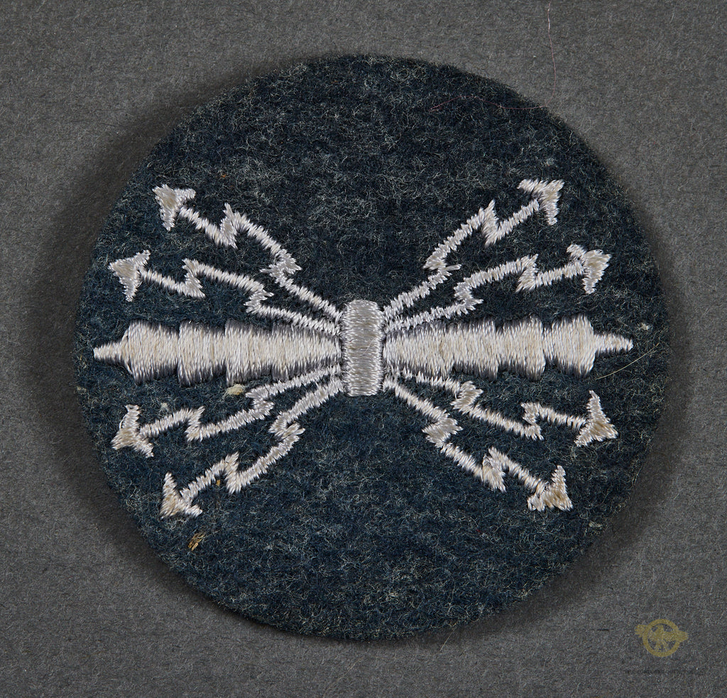 German WWII Luftwaffe Qualified Radio Operator Patch-This is produced in blue gray badge cloth with white machine embroidered arrows. This is not piped. This patch is unissued and excellent.