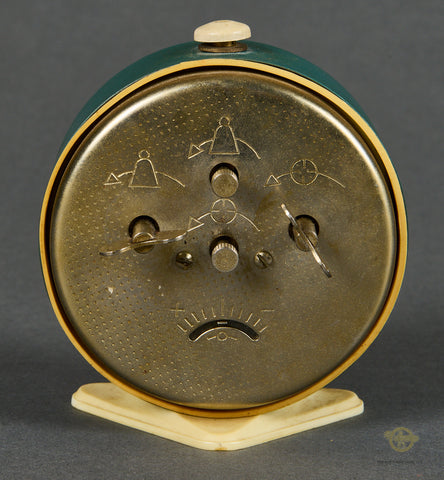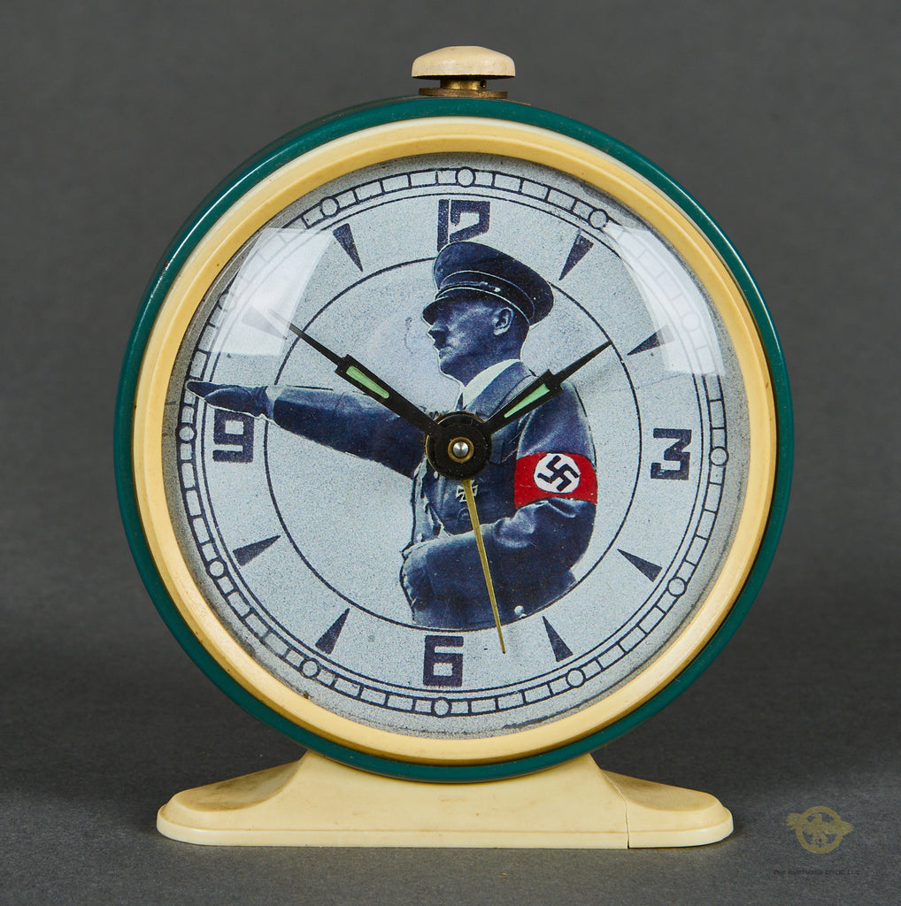 German WWII Novelty Hitler Alarm Clock-This is a very rare collectible. This is an alarm clock with a stylized black and white of a saluting Hitler. What makes this photo especially cool is the bright red party armband on his arm. Hitler’s saluting hand is at the 9:00 on the clock face. The clock itself is green painted stamped steel, with a white trim on the face. The white control on the top is also made of magnetic metal. This sits on a small white plastic base. The black hands have green glow in the dark paint on the hands. The face is covered in a clear glass that is scratch free. The reverse of this clock has the controls for setting time, alarm settings and speed. These are made in the style of a vintage Vityaz mechanical clock, which was made in the Soviet Union. It is unmarked at least externally. This clock still works, and in fact, we have used this here in the office for years. This clock measures 3 ½ inches (8.89 cm) in diameter and stands approx. 4 ½ inches (11.43cm) tall. A rare find.