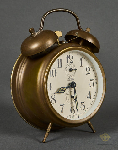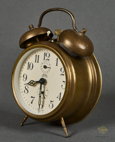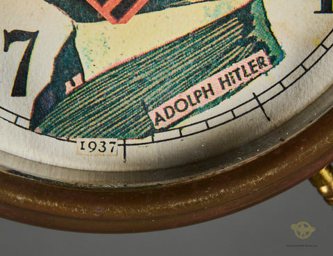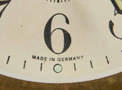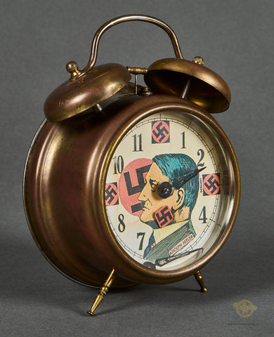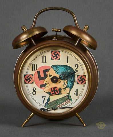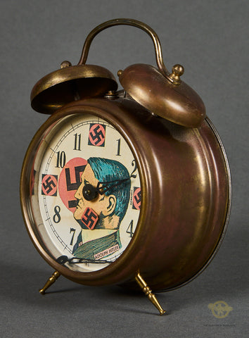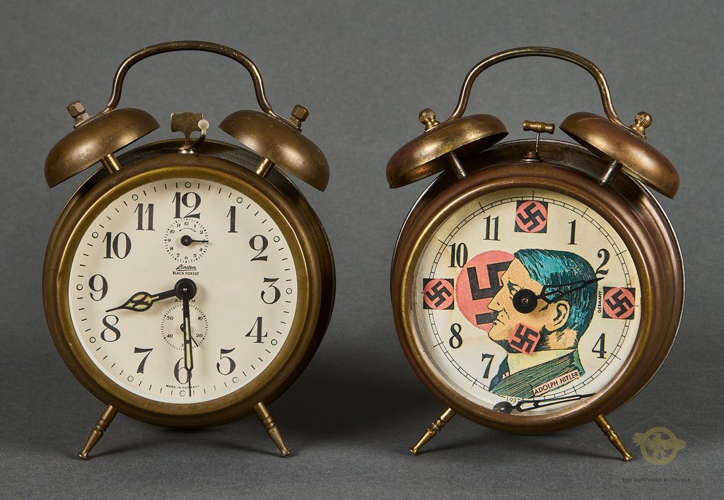 Interesting Pair of Alarm Clocks-Both of these clocks were brought home by the same veteran. The family did not wish to give us the name of the soldier, so we cannot supply any information on him. These clocks were probably produced pre-war, as they do say “Germany” on both of them. Both clocks are in very good condition, with the faces being very clean, and the front glass remaining scuff free. These clocks both function, in fact, one of these clocks was on Bill’s shelf for years. Both clocks are very well marked. Both clocks stand approx. 7 inches (17.78cm) tall and have a 4 inch (10.16cm) diameter face. One of the clocks has a graphic of Hitler. This clock has a broken minute hand. We are uncertain if the glass can be removed so that this can be repaired. Please be sure to look closely at the photos. Again, this clock works, but obviously has a broken hand. This clock also has an issue with its legs, one is loose and the other is shortened. They are in good condition overall and would make a neat addition to your collection.
