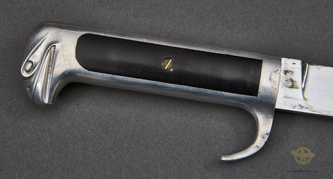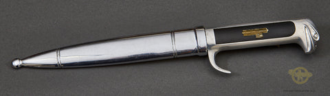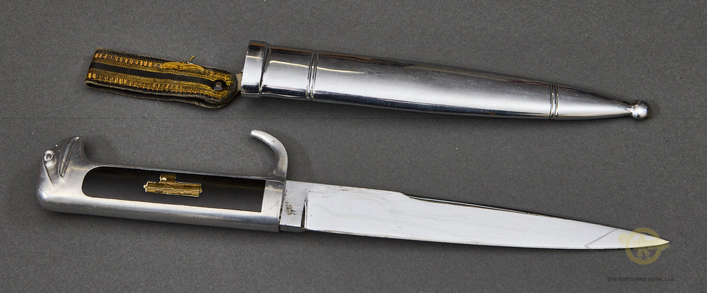 Italian Fascist Model 1932 Dagger-A beautiful example of the 1932 model. It measures approx. 12” in length, with a hilt made out of polished aluminum with an eagle head pommel. The black enameled grip plates have the gold Fascist bundle on the obverse. You can see the bolt on the reverse that holds the bundle to the grip. The silvered steel scabbard retains 95% of its original finish. This shows only light use, no real damage. The blade is very good overall. This comes with a small gold and black hanger that has been with this piece forever. A cool little knife.