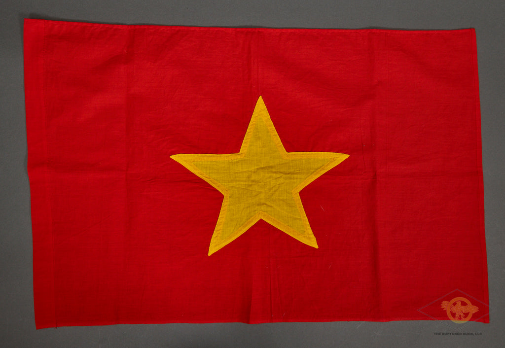 NVA or Vietnam National Flag- Unsure of the vintage on this flag but was purchased from an old collection. It has a red bunting material with a separately applied yellow star. The star pattern was cut out of the red field then the star was applied. There looks to be a very small remnant of a tag on hoist end. The hoist end is folded over to accommodate a pole or dowel for hanging. It measures 30” (76cm) x 20” (51cm). It is in very good condition!