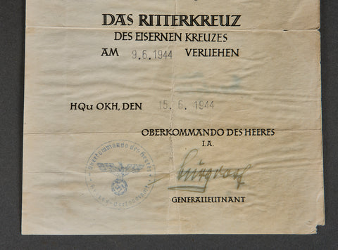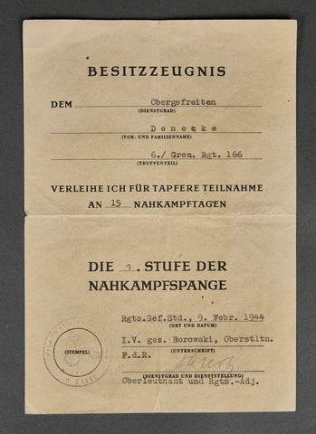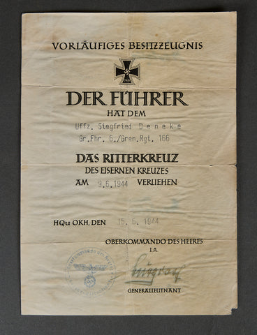 Provisional Certificate for the Knight's Cross of the Iron Cross-Awarded to Unteroffizier der Reserve Siegfried Deneke, Gruppenführer 6. Kompanie, II. Bataillon, Grenadier-Regiment 166, 82. Infanterie-Division, Heer on 9.06.1944. Certificate measures 148mm x 207mm, double folded, exhibiting storage age, signed by Burgorf 15.6.1944. included is his award certificate for 1. Stufe Nahkampfspangen dated 9.2.1944 measures 139mm x 198 mm exhibiting storage age. Date of birth: May 19th, 1908 (Dortmund/Westphalia, Germany), Date of death: March 16th, 1944 (Torkov). Promotions: August 6th, 1942: Obershütze;, March 16th, 1944: Unteroffizier d.R. The following press article from the Bremer Presse (dated 04.08.1944) describes why Deneke would be awarded the Knight’s Cross…