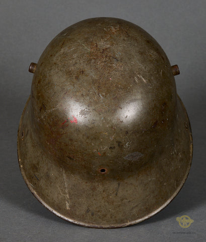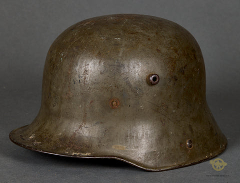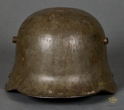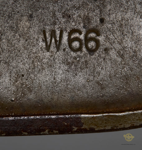 WWI German Model 1917 Combat Helmet-This is the shell only, there is no liner but there is a steel liner band. The finish is field grey and it remains 70% intact. The side of the interior is stamped W 66 indicating production by Hermann Weissenburger & Co., Stuttgart-Cannstatt who made shells in exclusively this size only. A good example!