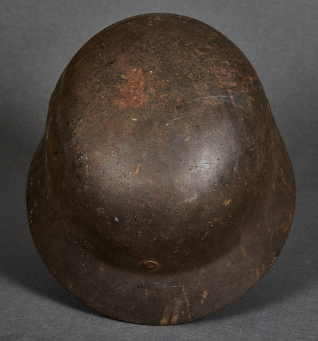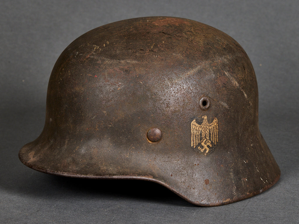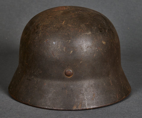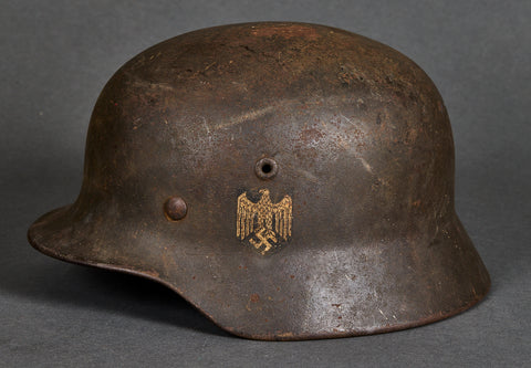 WWII German Army Model 1940 Single Decal Helmet-This combat veteran has a field grey finish that shows some wear and discoloration from use, checking in at 70% intact. The army decal is toned and remains very nice at 80%. Inside is a size 59 leather liner that has a lot of wear and tear with scuffing and tears etc. There is a zinc liner band that is maker marked, dated 1941 and size stamped 66/59. There is a replacement drawstring. The left side of the interior is stamped Q 66 indicating production by Quist in the size of 66. The rear skirt is stamped with the lot number DN 85. Interestingly, the “D” is reverse stamped. There are remnants of the original brown leather chinstrap. A good example overall!