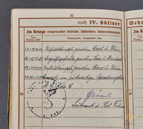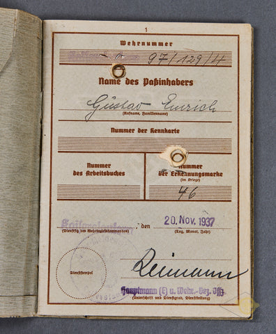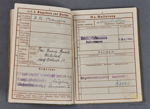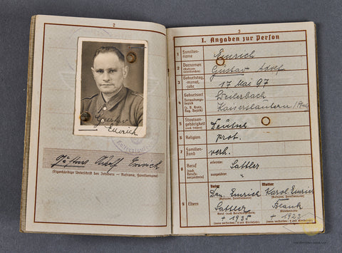 WWII German Army Wehrpass-This book was issued to Gustav Adolf Eurich, born 17 May 1897 in Kaiserlautern. He was married and both of his parents had passed when this was issued on November 20, 1937. There is a photo of him riveted to the interior. Page 32 indicates that he saw front line combat from March of 1939 through January of 1940. He was a gefreiten. I can see that he served with infantry regiment 118. He received the EKII. A fun research project!