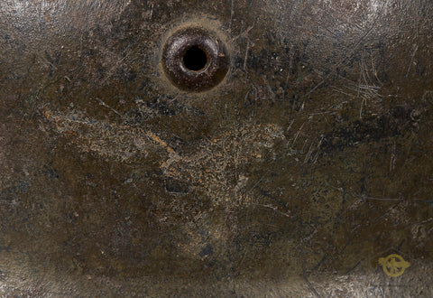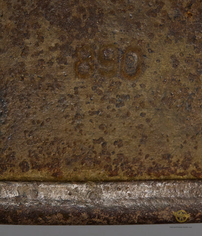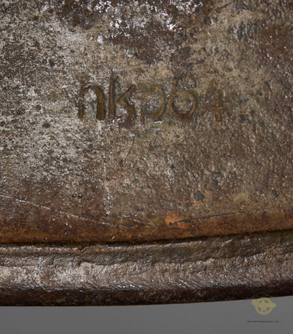 WWII German Luftwaffe Model 1940 Single Decal Camouflage Helmet-This combat example has a worn and faded green camouflage finish that extends into the interior skirt. It was originally a rough texture; some of that is still evident around the brim. The remnants of the Luft decal are evident in the outline that is seen. Inside is a size 57 leather liner that was treated by the Gi that brought it home. Most likely he used Vaseline or something similar and this has preserved the softness (it’s a little stiff) of the liner but has darkened it significantly. There is a zinc liner band and a drawstring. The left side of the interior is stamped hkp 64 indicating production by Sachsische Emaillerwerke in the size of 64. The rear skirt is stamped with the lot number 890. There is a brown leather chinstrap as well. It was also treated at some point. A sound example!