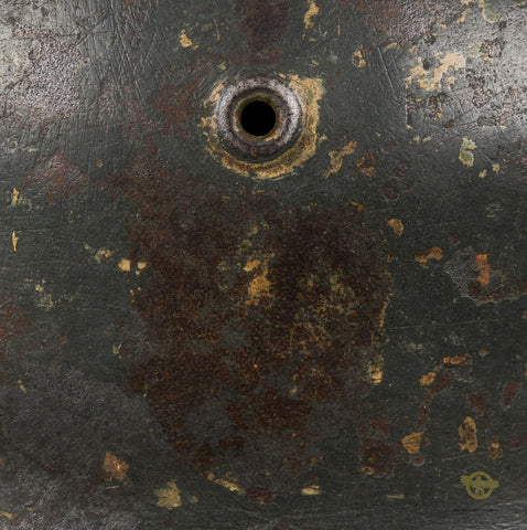 WWII German Model 1942 Army Ex-Camo Helmet-This combat example shows signs of a green and tan camouflage finish. It is almost entirely gone and the original field grey finish is mostly intact. The army decal was removed at some point.  Inside is a soft, brown leather, size 57 liner. It shows minor wear, discoloration and scuffing from use. There is a drawstring and a zinc liner band that is maker marked, dated 1943 size stamped 64/57. The rear skirt is stamped ET 64 indicating production by Eisenhuttenwerke of Thale in the size of 64. There is a lot number 3076 as well. A sound example overall!