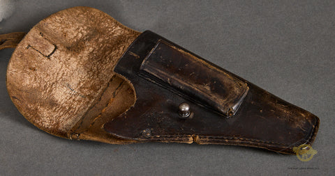 WWII German PPK Holster- This is made of a soft black leather that is still supple for use. It is unmarked. Stud and strap are in place and in good condition. The original belt loop is present. Leather has some scuffing and a small hole of wear that has gone through on bottom of the magazine holder. There are two small pin like holes on flap near the strap reinforcement that is hardly worth mentioning. In sound condition.