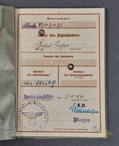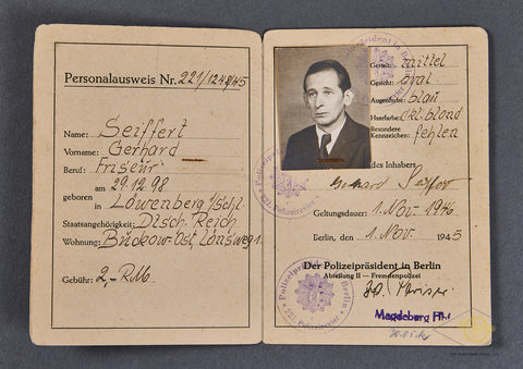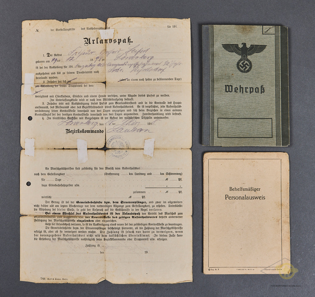 WWII German Wehrpass with Additional Documents-This is for Gerhard Seiffert, born 29.12.1898 in Löwenburg. The Wehrpass is complete with many entries and a photo. There is a post war identification card which is also quite complete and has a photo. It is dated November 1, 1946. There is a document that was in the Wehrpass that is dated March 18, 1918. It is a holiday pass that was issued to him, It is quite worn but still a nice addition. Overall nice!
