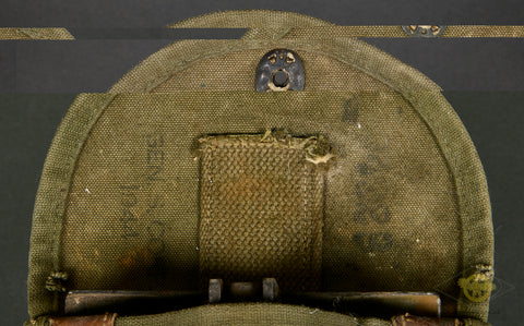 WWII US Army Folding Entrenching Tool Shovel- This is an m43 later pattern cover that allows the hook on back to move into three different positions. It shows some wear. Under flag it is maker marked Gen S Corp. 1944. There is also a GI laundry number that has somewhat faded. O 4328? The Shovel has moderate wear. The wood handle has no more original OD green paint and a chip out of wood on lower handle. The helve of the shovel retains some original paint and a period repaint. It is marked US Wood 1945, and is a harder to find shovel. The locking nut works well but shows signs of someone using a tool to loosen at one point.