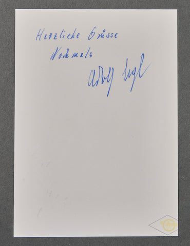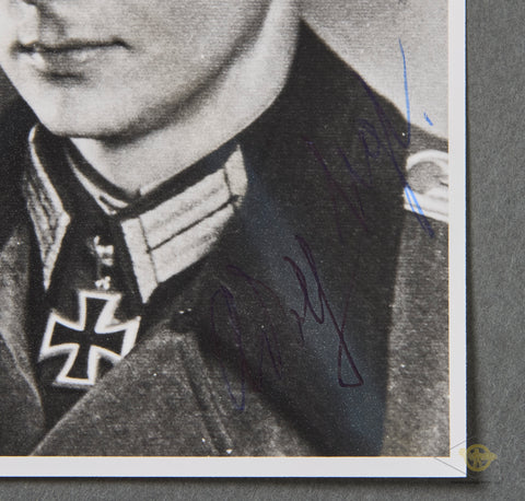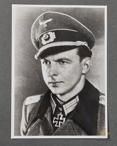 German WWII Signed Photo of Knights Cross Winner Adolf Vogt-Vogt was the commander of 12th company of the Grenadier-Regiment 1054, a unit of the German Wehrmacht that was formed in November 1944 and was part of the 352th Infanterie-Division. The regiment was the primary infantry element of the division and served in various major battles, including the Battle of Normandy. This regiment was actually developed to replace a regiment that had been destroyed during the battle of Normandy. Adolf Vogt, was an Oberleutnant (First Lieutenant), commanded the 12th Company and was awarded the Knights Cross of the Iron Cross for his bravery during the German retreat from France in late 1944. The regiment was destroyed in the Eifel region in 1945. Adolf went on to survive the war, and died in 1992 in Sindolsheim Germany. This is a signed black and white photo of Vogt. The signature is rather light, but readable. There is also a handwritten note and another signature on the reverse. The photo measures 5 ½ inches (13.97cm) long and 4 inches cm) wide. It is in very good condition. It comes with the original mailing envelope. Very good overall.