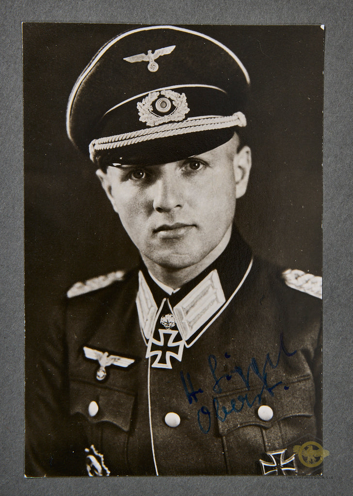 German WWII Signed Photo of Knights Cross Winner Hermann Siggel-Siggel was the commander of Grenadier Regiment 172. The Knights Cross recommendation of Oberleutnant Siggel lists 13 actions that led to his award of the Knights Cross. For example, leading a counterattack with his troops while serving as a rearguard during the retreat from Voronezh to Ssumy. This took place near Golowischka in 1943. Commanding an alarm unit on the railway embankment Nish-Syrowatka, and leading a retreat battle East of Kiev. There are many more encounters that are worth looking up. This photo measures 5 ½ inches tall and 3 ¾ inches wide. It is in very good condition. The signature can be seen on the lower right corner. There is a small note written on the lower portion of the reverse. This would be a fun project to research more on this guy.