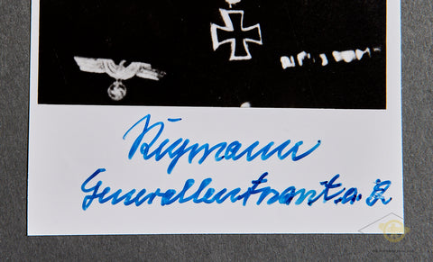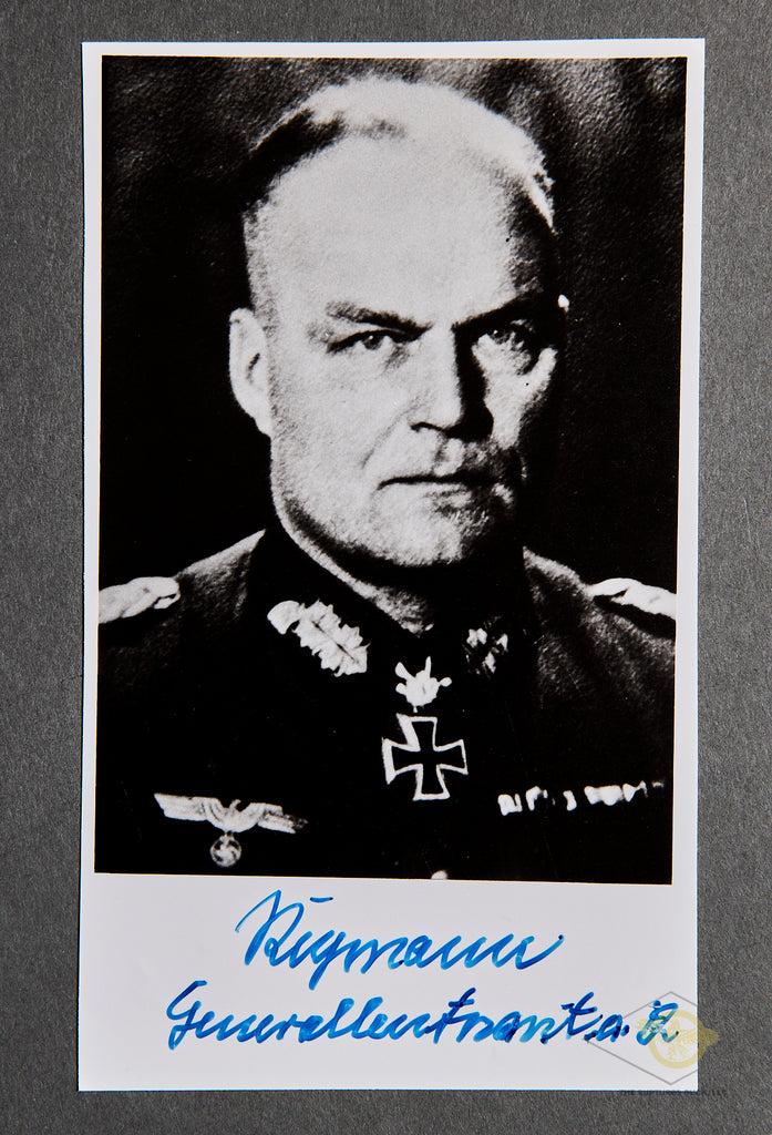 German WWII Signed Photo of Knights Cross Winner Reymann Hellmuth- Reymann was a Generalleutnant of the 212th Infantry division. This division was part of army group north and was based in Northern Russia. From 43-44 he was transferred to the 13th air force field division, which suffered heavy losses in the retreat from Leningrad, and was disbanded in 1944. Reymann then commanded the 11th Infantry Division. In October 1944, Reymann's division was encircled in the Courland Pocket, and he was replaced by General Gerhard Feyerabend. In 1945 he was one of the last commanders tasked with the defense of Berlin as the Soviets were at the door and everyone was fleeing the city. A very interesting story to read. This photo is signed by Reymann, in blue pen at the lower margin of the photo. The photo is in very good condition. The photo is a big, larger format, measuring 6 inches (15.24cm) wide and 3 ½ inches (8.89cm) tall. It is in very good condition. An interesting person.