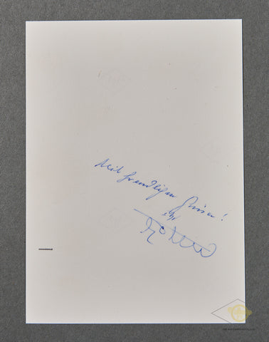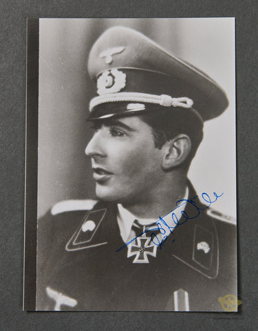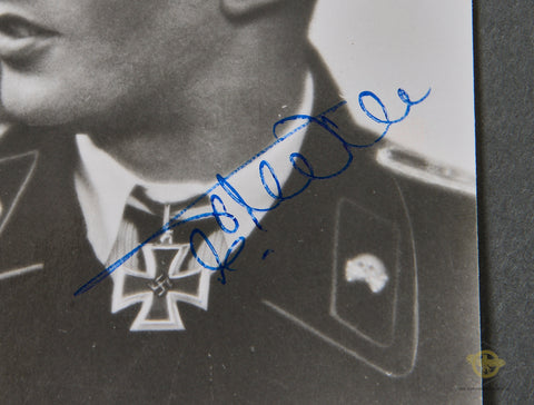 WWII German Photo Signed by Panzer Knights Cross Recipient Andreas Thaler- Andreas Thaler, is a distinguished Panzer officer and commander of the 7th Panzer Division. This division was an armored formation of the German Army in World War II. It participated in the Battle of France, the invasion of the Soviet Union, the occupation of Vichy France, and on the Eastern Front until the end of the war. The 7th Panzer Division is also known by its nickname, the Ghost Division. Thaler was awarded the knights cross on January 13th, 1944. This is a typed letter, with a signed black and white photo of our handsome soldier. The photo measures approx. 4 ½ inches (11.43cm) long and 3 ½ inches (8.89cm) wide and is in very good condition. The front of the photos is signed in blue ink, and there is a little note from Thaler on the reverse side in blue pen as well.