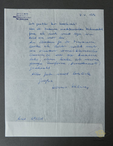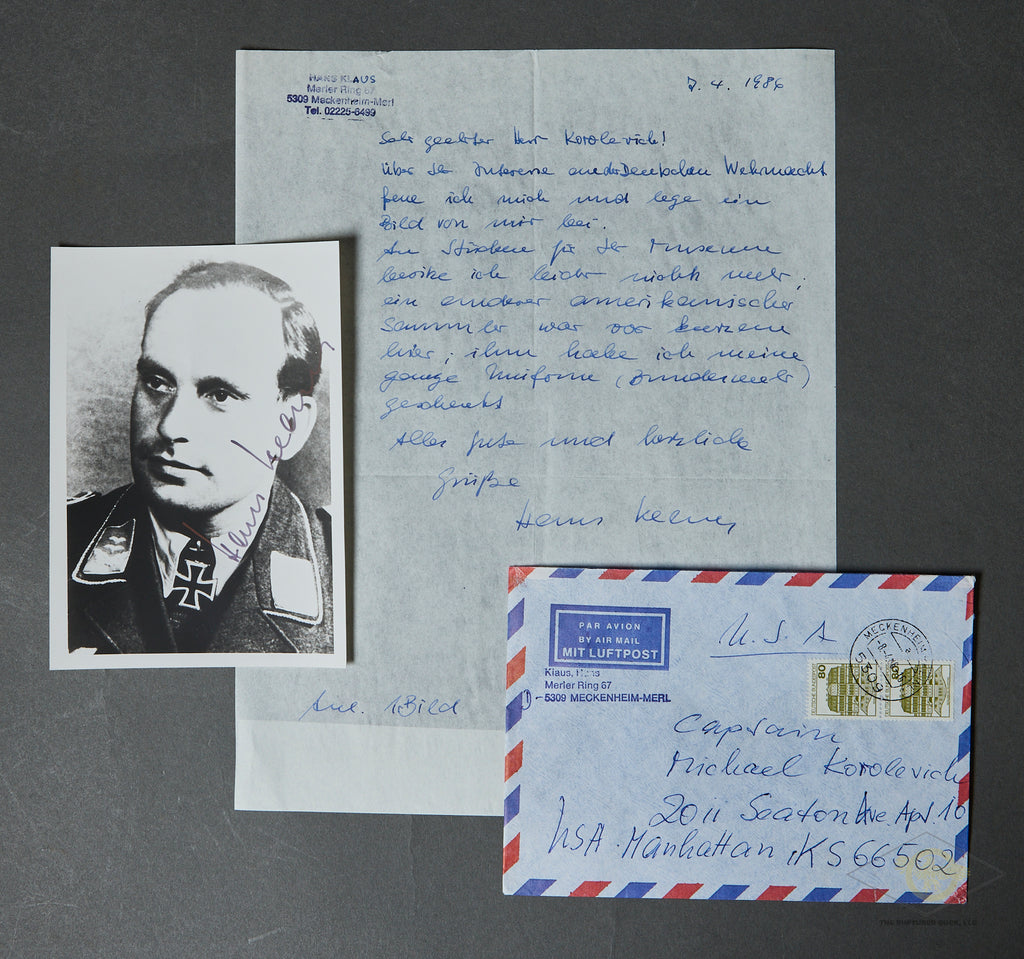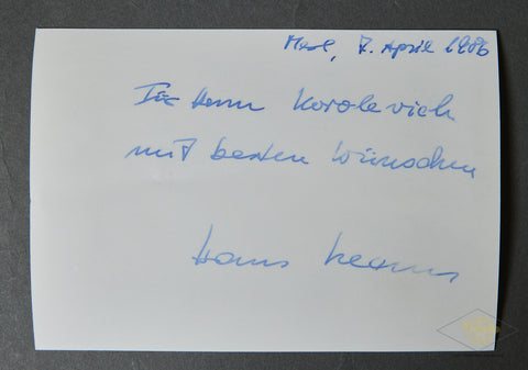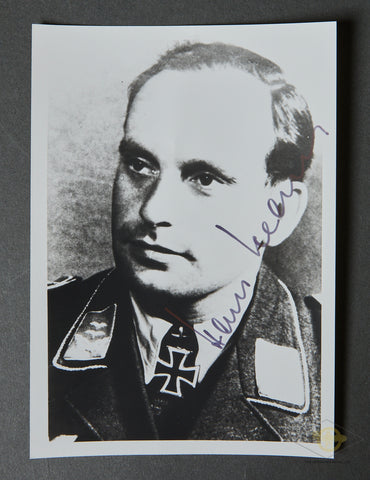German WWII Signed Photo of Knights Cross Winner Hans Klaus-Johann “Hans” Klaus was a Luftwaffe Stuka Ace with over 800 sorties to his name. He served primarily with Sturzkampfgeschwader 1 (StG 1), a specialist dive-bomber wing operating the Ju 87 Stuka, and later with Schlachtgeschwader 1 (SG 1) flying the Fw 190.He flew a total of 812 combat missions, mostly on the Eastern Front. During his career, he was credited with destroying: 65 tanks, 10 trains, 37 artillery guns and 5 rocket launchers. On October 20, 1944, his aircraft was shot down by Soviet anti-aircraft fire (flak) over enemy territory. He was taken as a prisoner of war by the Soviet Union and was not released until October 1949. This card measures approx. 6 inches (15.24cm) tall and 4 inches (10.16 cm) wide. It contains a nice signature across the front as well as a note on the back with a second signature. This also contains a note written in blue ink and dated 1986. We have not translated the note. This is in very good condition overall. This would make an awesome research project!