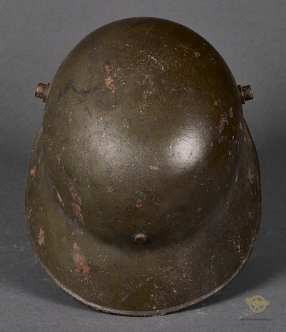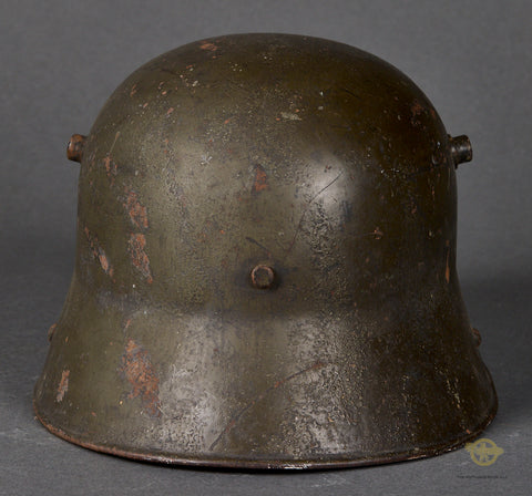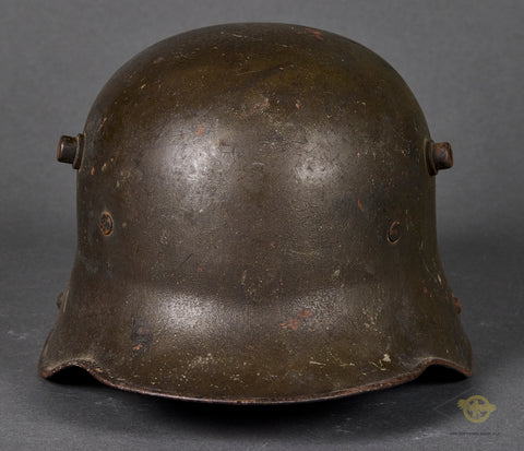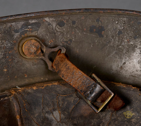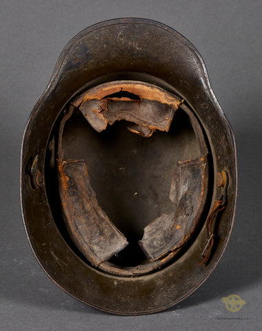 German WWI Army Model 1916 Combat Helmet-This example has a field grey finish that remains 85% intact with a few very minor dings. The interior has the original three pad leather liner and leather liner band. It is rough but mostly intact. The side of the interior is stamped GBN 64 indicating production by Gebrüder Bing A.G., Nürnberg (Bavarian maker) in the size of 64. One small section of the chinstrap with the buckle is included as is the hooks for the chinstrap on both sides. A good example overall!