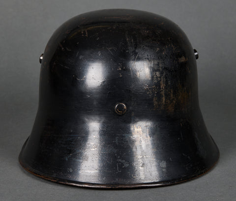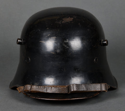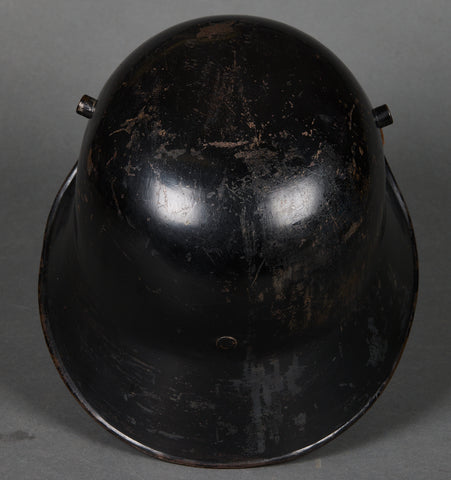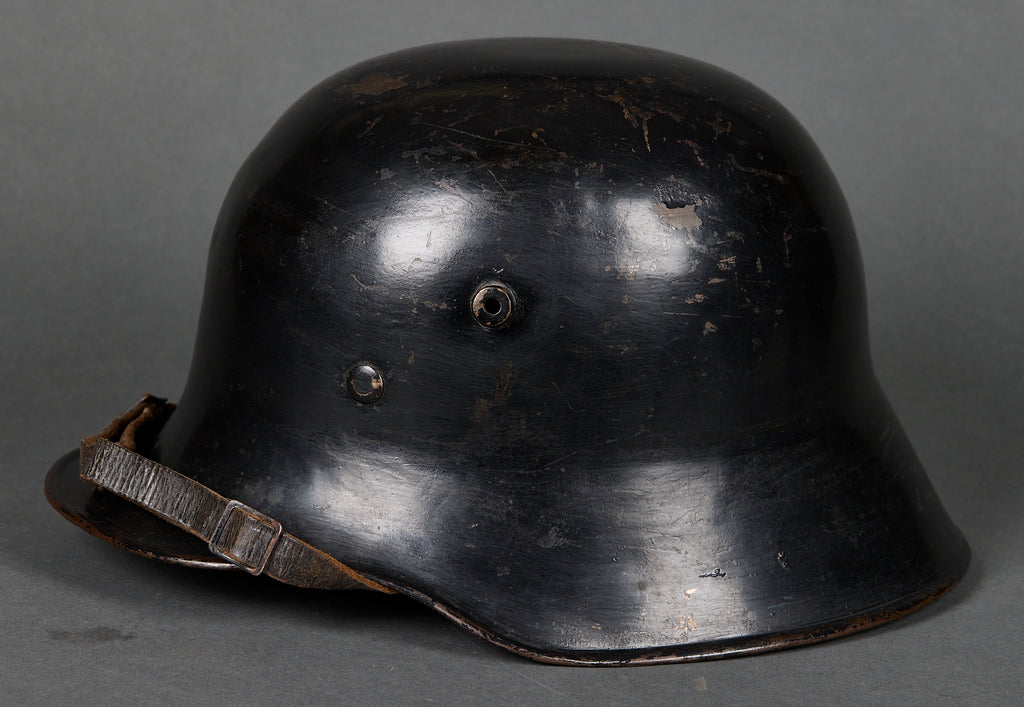Third Reich Model 1918 RZM Style SS Helmet-This unique helmet has a satin black finish that remains 75% intact overall. There is a three pad brown leather liner that is clean and remains soft, with a leather liner band and a drawstring. This has a piece of duct tape on the inside which has veteran information that reads “To John David Hultkrans, From His Dad, V-E Day May 8, 1945, Zeuleroda, Germany”. I see no markings on the liner or the shell. But what is great is that the SS member wrote the following in the dome: “SS A. Pfeiller”. There is a worn but complete brown leather chinstrap as well. This is a large size, a 66 I believe. A unique piece in great overall condition!