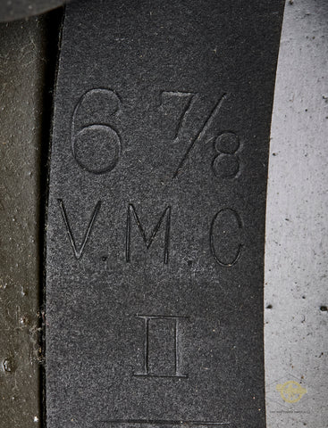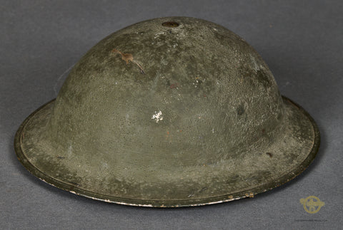 WWII Camouflage Brodie Helmet-This would have been used by British or Canadian forces. It has a thick, gritty green camouflage finish that remains mostly intact. The liner is a bit dirty and stiff but it is tightly fitted and fully intact. There is a thick, tan canvas chinstrap that is in fine condition.